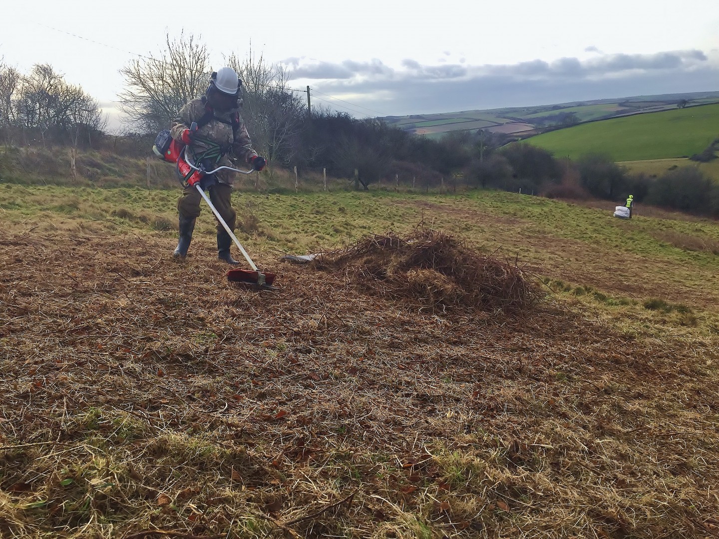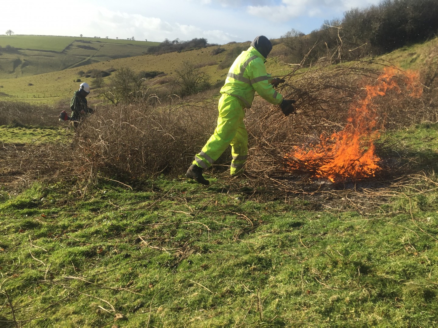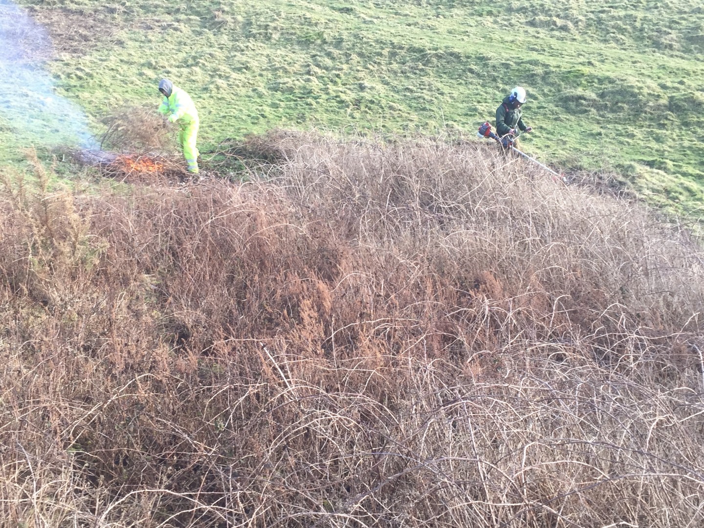 The Coastal Tree Care team is currently engaged in some scrub clearance work for Natural England at Hog Cliff National Nature Reserve, near Maiden Newton. The work involves removing extensive overgrown areas of bramble and gorse to give the grazing animals a bit of a ‘head start’, and encourage recolonisation by the host of diverse grass, wild flower and orchid species that are present on this SSSI site.