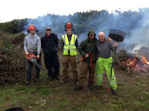 As we approach the end of the Portland Living Landscapes project, we have just started to tackle a substantial area of scrub management over a former landfill site. The intention is to remove all of the brambles, buddleja and gorse to enable the establishment of grasses and flowering plants – for the benefit of invertebrates and other families of fauna. If you were out today, you will appreciate just how miserable the weather has been, but the scrub bashing team still managed to squeeze out a grin or two for the obligatory team photo…